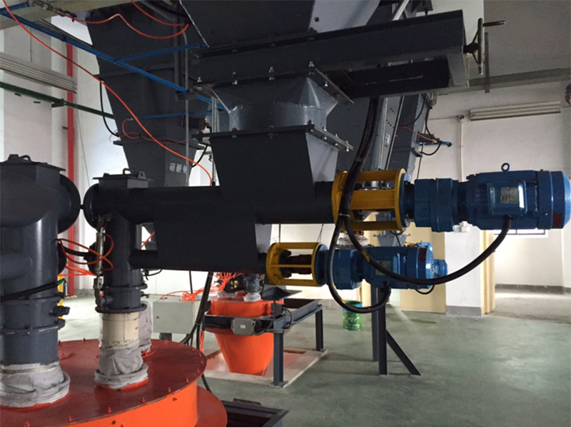 產(chǎn)品描述: 螺旋給料機(jī)是集粉體物料穩(wěn)流輸送、稱重計(jì)量和定量控制為一體的新一代產(chǎn)品;適用于各種工業(yè)生產(chǎn)環(huán)境的粉體物料連續(xù)計(jì)量和配料;采用了多項(xiàng)**技術(shù),運(yùn)行可靠,控制精度高;尤其適用于建材、冶金、電力、化工等行業(yè)粉體物料的連續(xù)計(jì)量和配料。 螺旋給料機(jī)把經(jīng)過的物料通過稱重橋架進(jìn)行檢測重量,以確定膠帶上的物料重量,裝在尾部的數(shù)字式測速傳感器,連續(xù)測量給料機(jī)的運(yùn)行速度,該速度傳感器的脈沖輸出正比于給料機(jī)的速度,速度信號和重量信號一起送入給料機(jī)控制器,控制器中的微處理器進(jìn)行處理,產(chǎn)生并顯示累計(jì)量/瞬時流量。該流量與設(shè)定流量進(jìn)行比較,由控制儀表輸出信號控制變頻器改變給料機(jī)的驅(qū)動速度,使給料機(jī)上的物料流量發(fā)生變化,接近并保持在所設(shè)定的給料流量,從而實(shí)現(xiàn)定量給料的要求?! ≈饕攸c(diǎn) 1、專用于粉狀物料的計(jì)量和控制。 2、給料螺旋具有獨(dú)特的穩(wěn)流結(jié)構(gòu),在整個進(jìn)料口截面上料粉均勻下沉,不易結(jié)拱,不易沖料?! ?、擺線針輪減速電機(jī),保證了長期穩(wěn)定運(yùn)行?! ?、穩(wěn)流螺旋采用變螺距結(jié)構(gòu)和出口溢流方式,有效的解決了物料的沖料難題(產(chǎn)量>60T/H采用雙管穩(wěn)流)?! ?、計(jì)量螺旋秤采用3只高精度傳感器(拉力)直接稱重結(jié)構(gòu),成功的解決了杠桿稱重造成的誤差,使計(jì)量精度大為提高?! ?、采用數(shù)字采集模塊,有效分辨率高達(dá)100萬;采集速率50次/秒;年漂移小于50PPM;溫度漂移小于50PPM?! ?、密封結(jié)構(gòu),減少粉塵外揚(yáng)。